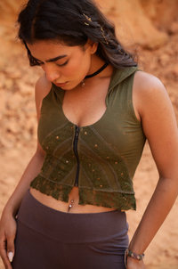The MATRIX VEST is designed with intricate lace detailing and accented by brass-tone stud embellishments. Featuring an asymmetrical front zipper and flowing lace hemline. Perfect as a layering piece or worn on its own.